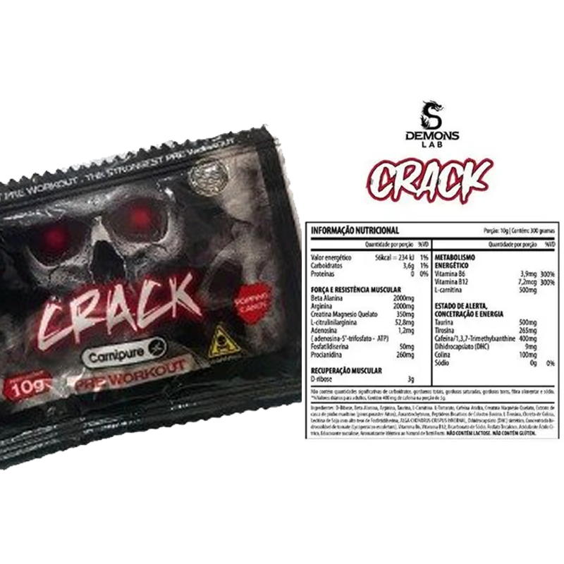 O Crack Pré-Treino Demons Lab é um suplemento de performance extrema formulado com 400mg de cafeína anidra, 2000mg de beta-alanina, 2000mg de arginina e 500mg de L-carnitina com selo Carnipure de qualidade. Esta combinação poderosa proporciona energia explosiva, foco mental inabalável e resistência muscular prolongada para treinos de alta intensidade.